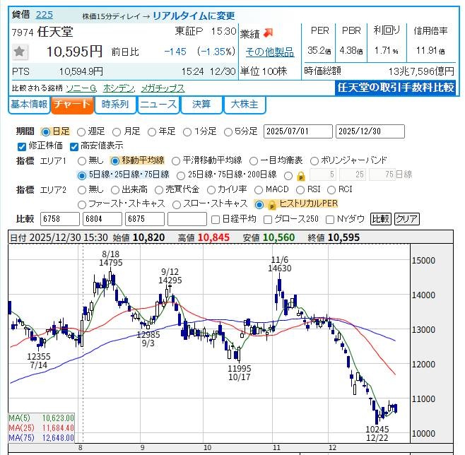 任天堂株、スイッチ2発売週から大きく下げて2025年を終える…