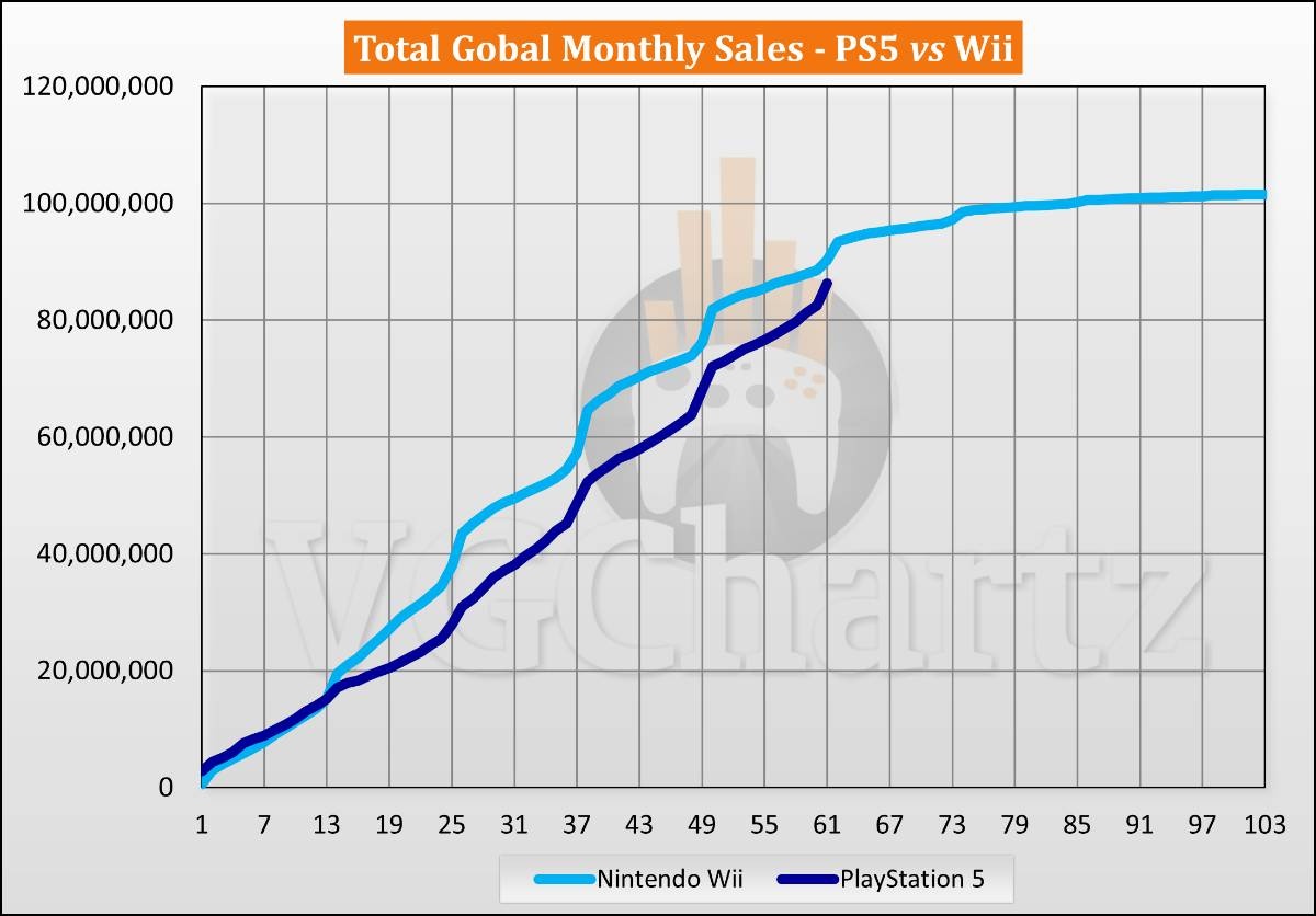 PlayStation 5は61ヶ月で8,612万台を販売しましたが、Nintendo Wiiは9,025万台を販売しました。