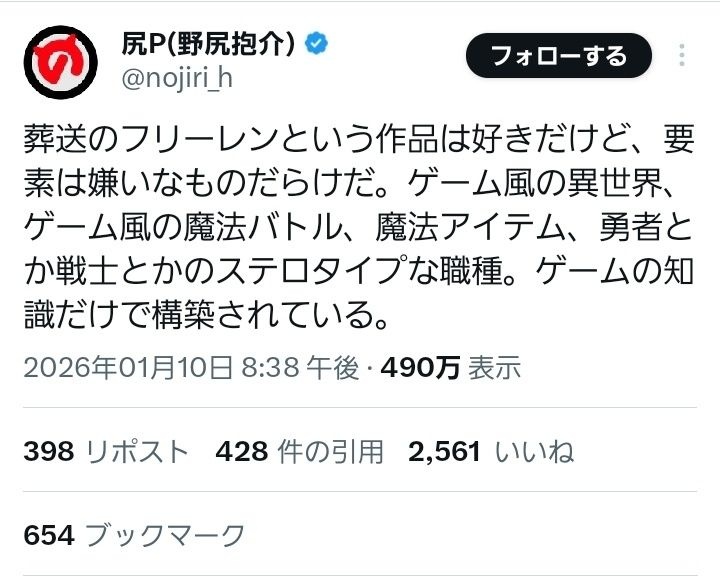 有名SF作家「葬送のフリーレンはゲームの知識だけで構築されてて嫌い」←炎上www