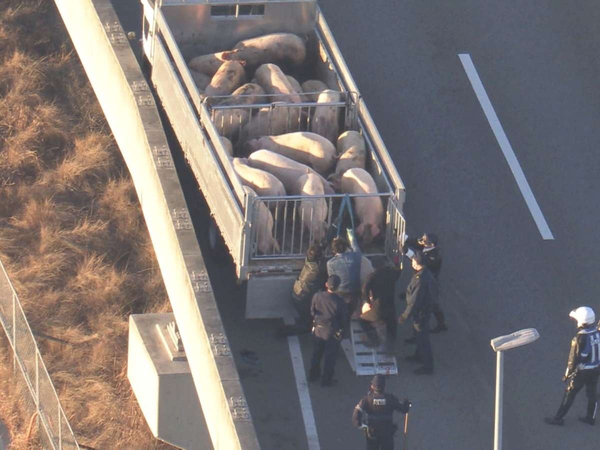 ブタは何らかの理由によって運搬中のトラックから逃げ出したとみられ、一部のブタは高架下の道路でも確認されています。