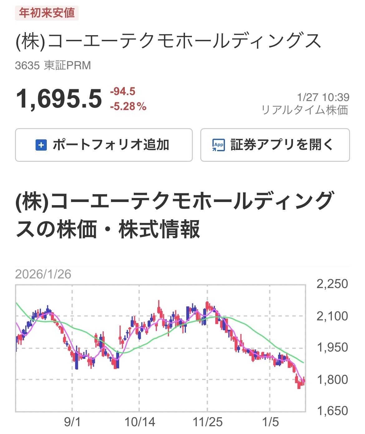 【絶望】コエテク株、年初来安値を更新。失望売りが加速し遂に禁断の安値圏に突入