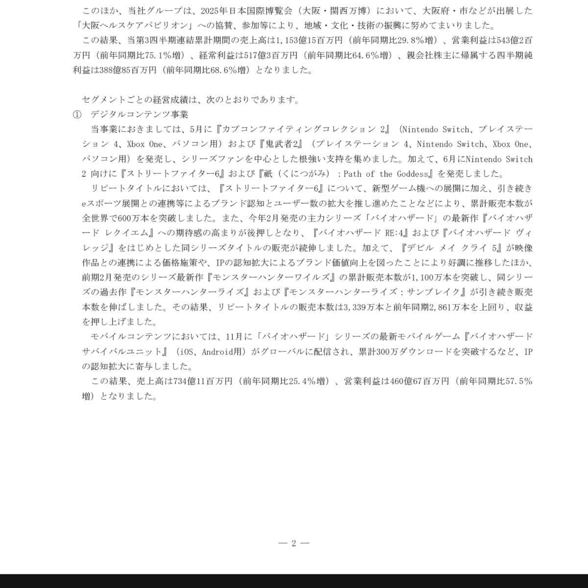 >今年2月発売のシリーズ最新作『モンスターハンターワイルズ』の販売に伴い、同シリーズの過去作『モンスターハンターライズ』が引き続き販売本数を伸ばすなど、第三四半期