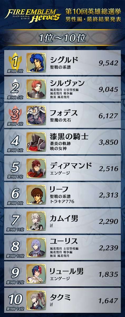 男性2位:シルヴァン(風花雪月 など)女性・男性、それぞれ1位2位の英雄さんは、夏に「総選挙version」として『 #ファイアーエムブレム ヒーローズ』に登場します♪