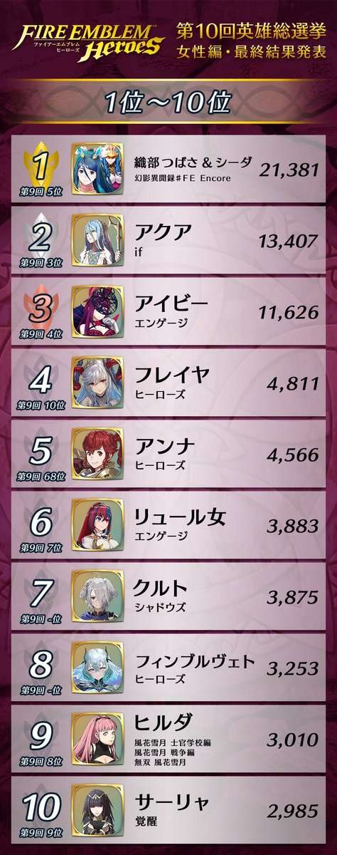 ファイアーエムブレム総選挙結果 1位シグルド、つばさ 2位シルヴァン、アクア