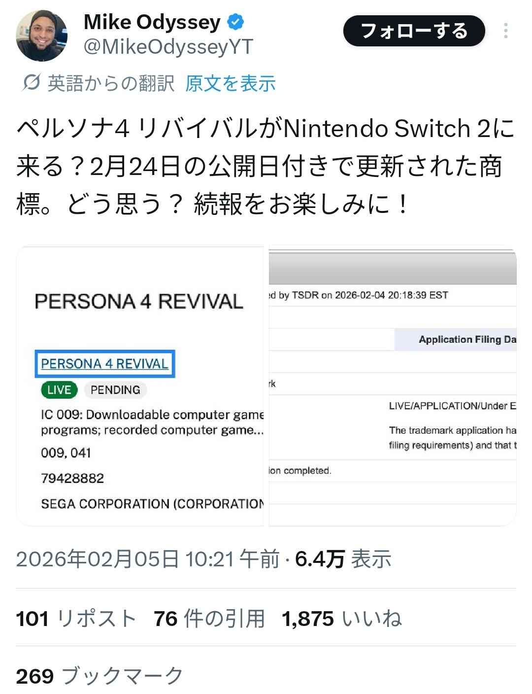 ペルソナ4Rの商標登録が更新!Switch2版か