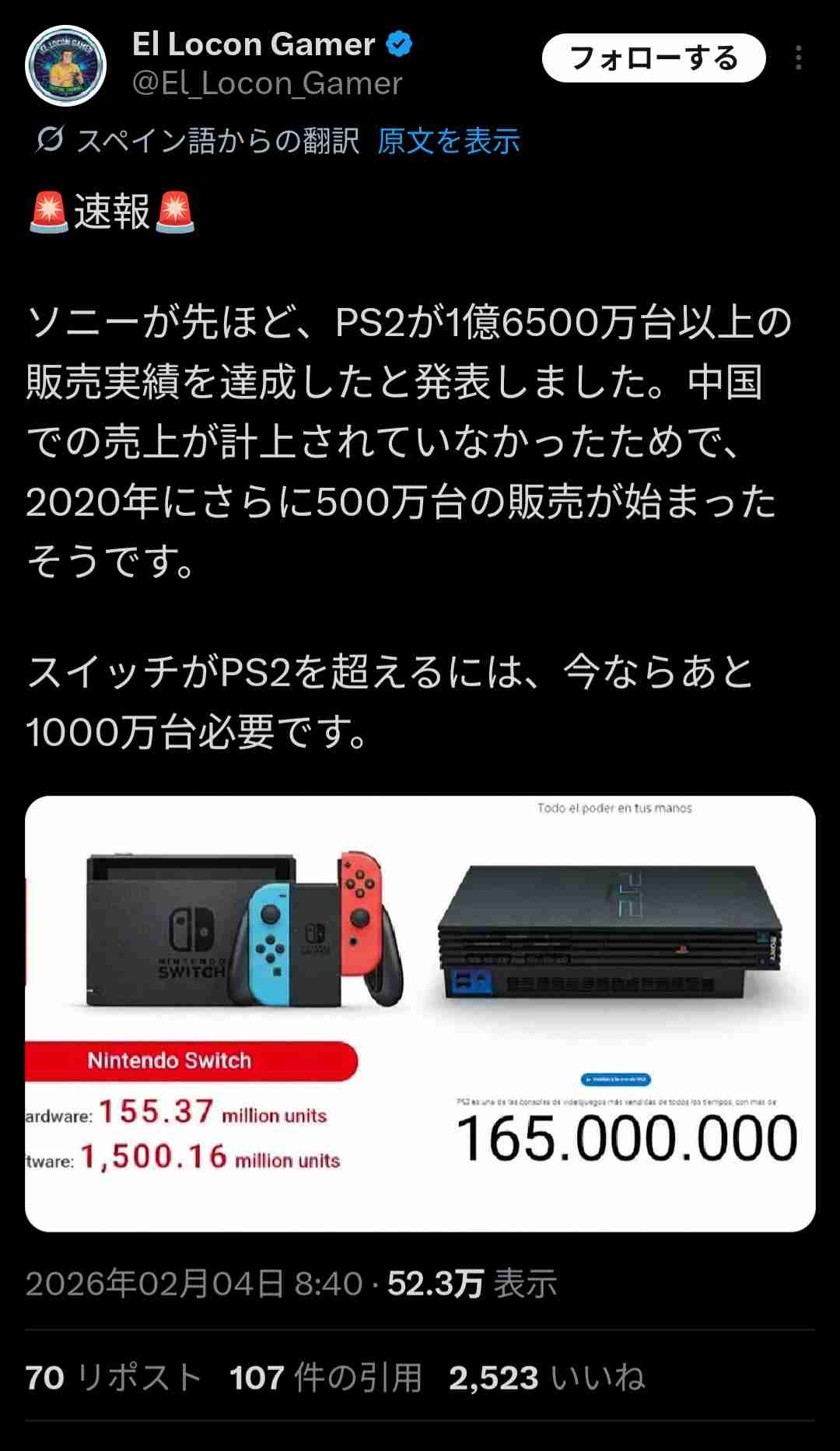 switchがPS2を超えるにはあと1000万台売れる必要がある模様