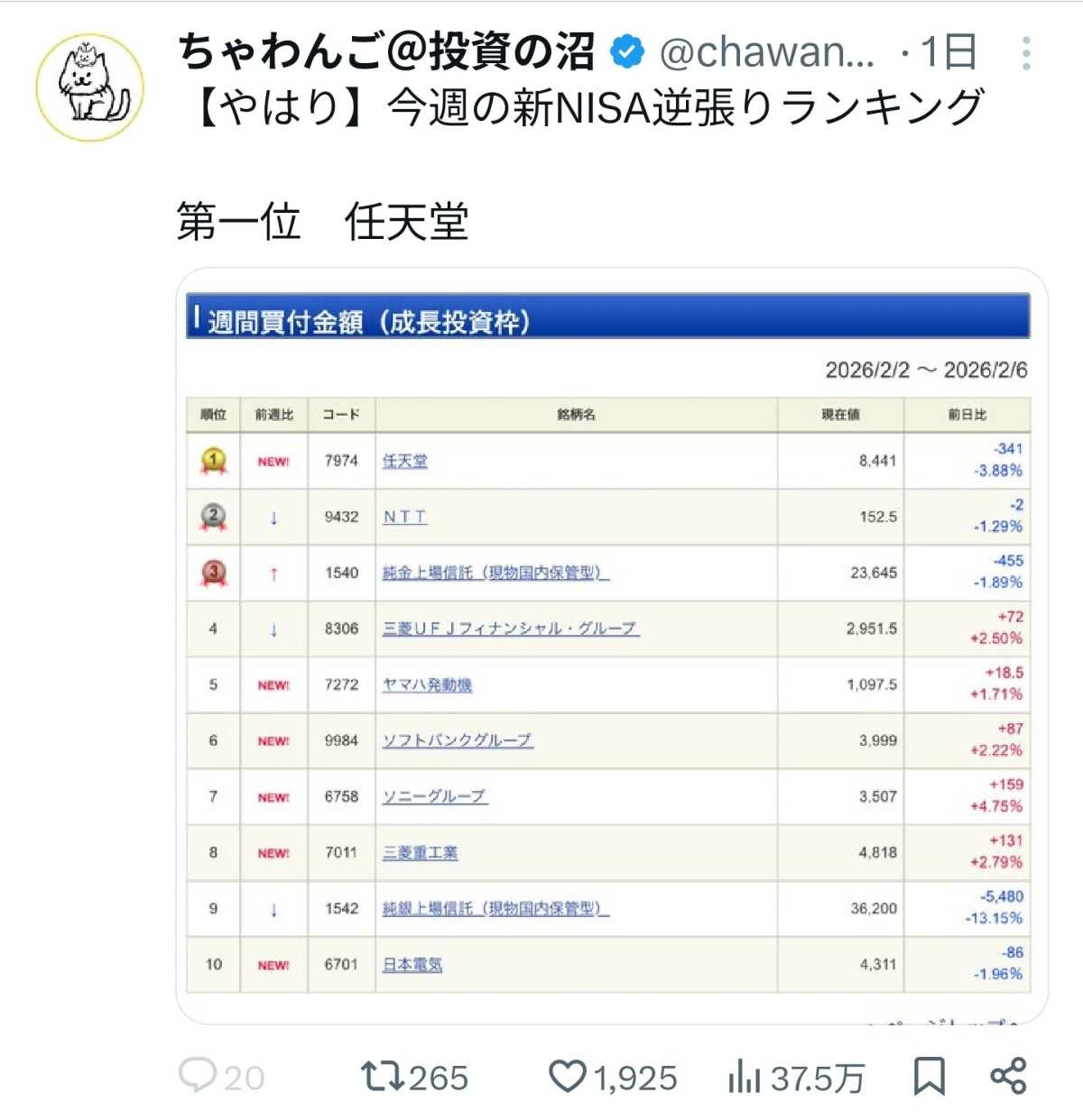 - 【やはり】今週の新NISA逆張りランキング