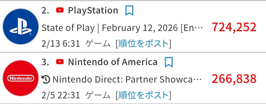 あんなに外人からも同じゲームしかねえのかよって叩かれた今回のステプレより人気なかったってマジで終わってんじゃんニンテンドーダイレクト - 74 : 2026/02/13(金) 14:48:19.06 ID:bB9rWZKJ0