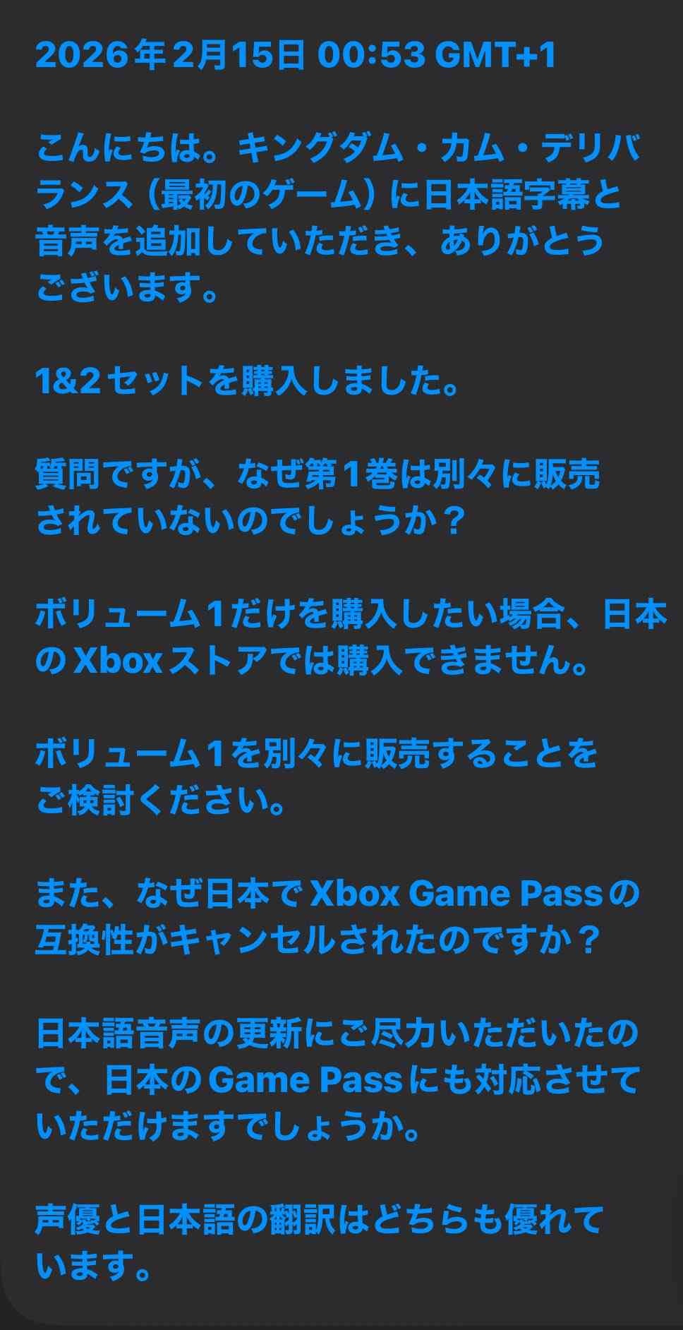 日本でもKDC1を発売したなら単体でもストアに出して欲しいと要望を出した、ついでにゲームパス対応についても聞いた