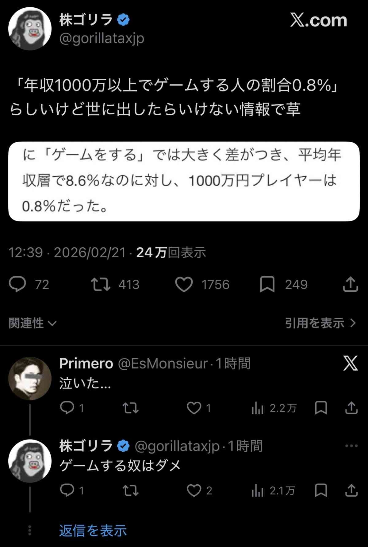 - 1000万以上稼ぐ人ってそもそもゲームする時間や余裕がないだけでは