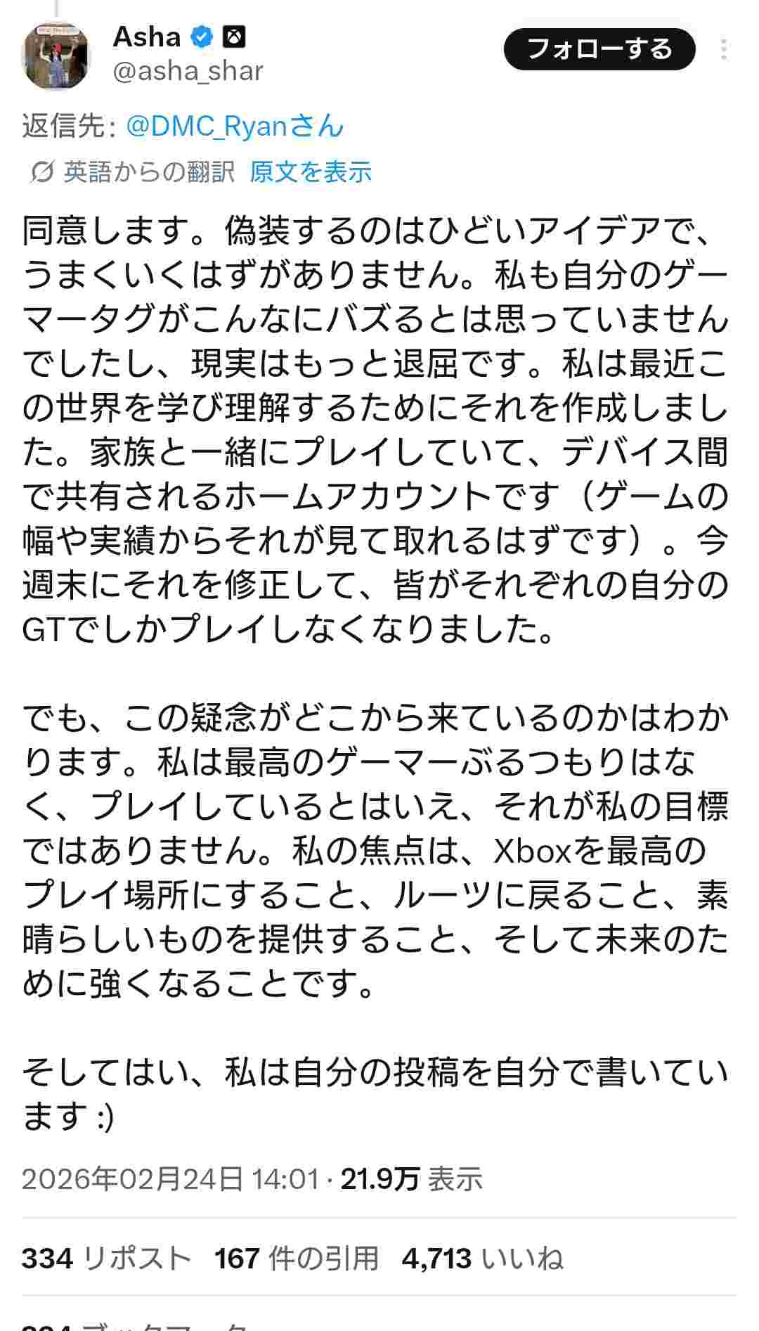 ゲーマータグを偽装し、実績スコアを水増しする為に家族にプレイさせたことを認める