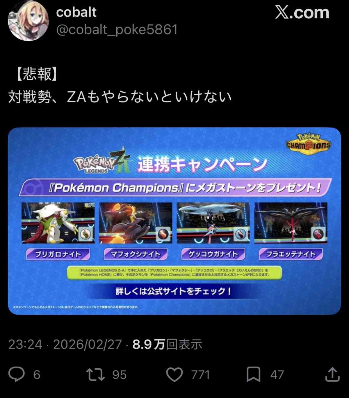【爆悲報】ポケモンチャンピオンズでメガシンカするにはZAのやり込みが必須と判明し大荒れwww