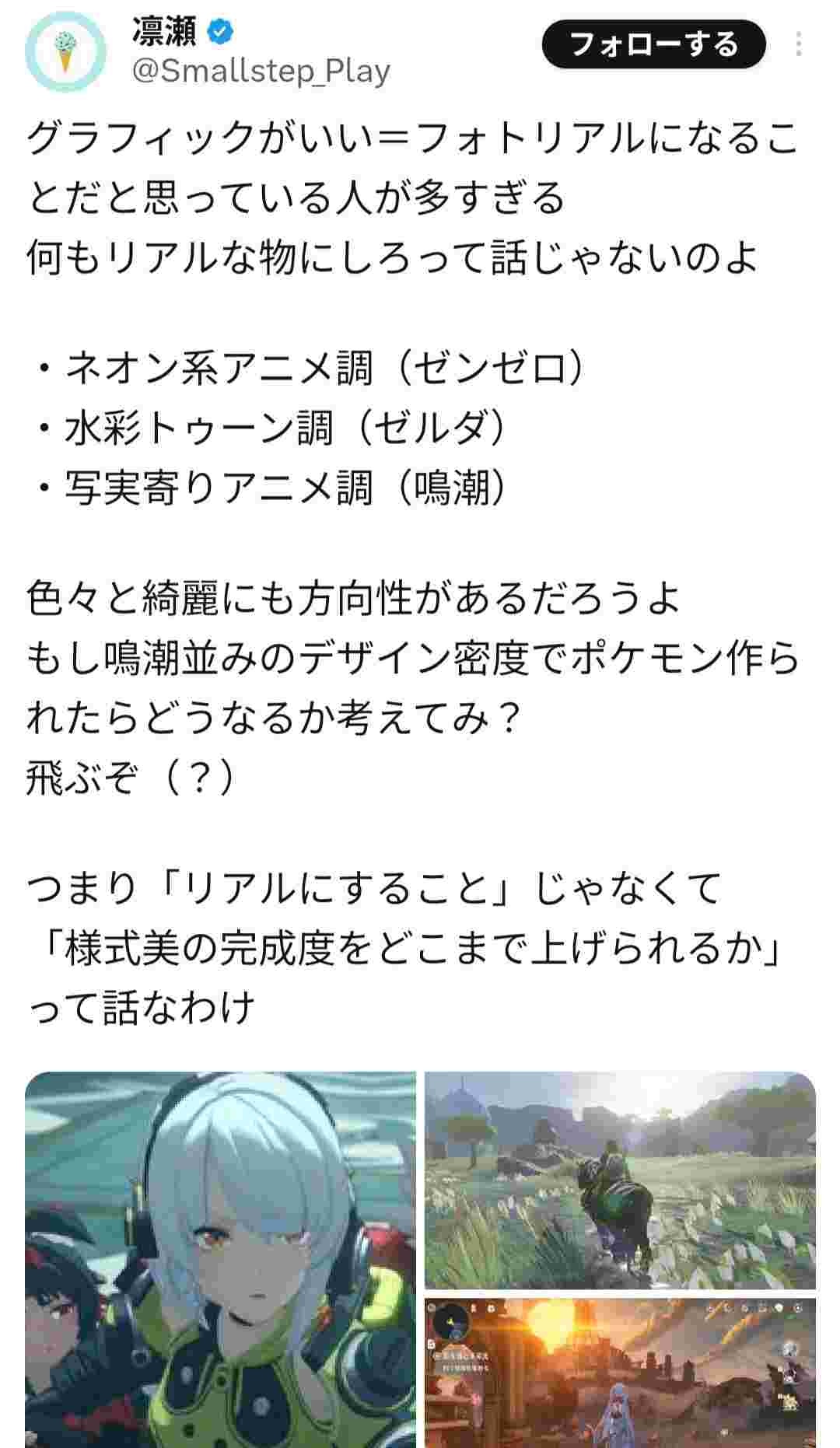 - ビーストリンカネ見て「フォトリアルすげえ!このグラでポケモンやりたいよぉ!」と言うやつもいれば「フォトリアルだけが綺麗さではない、アニメ調でやれ」とかいう奴もいるんだから大量にいるユーザーの声なんて聞いても無駄でしかない