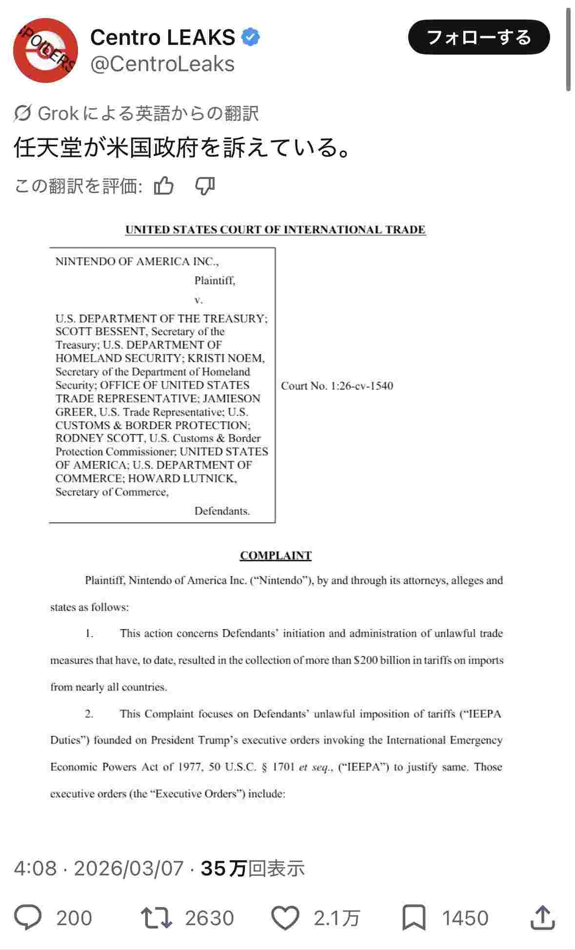 任天堂、違法関税を理由にアメリカ政府を提訴 - 2 : 2026/03/07(土) 07:38:42.76 ID:ftrxoa8dd