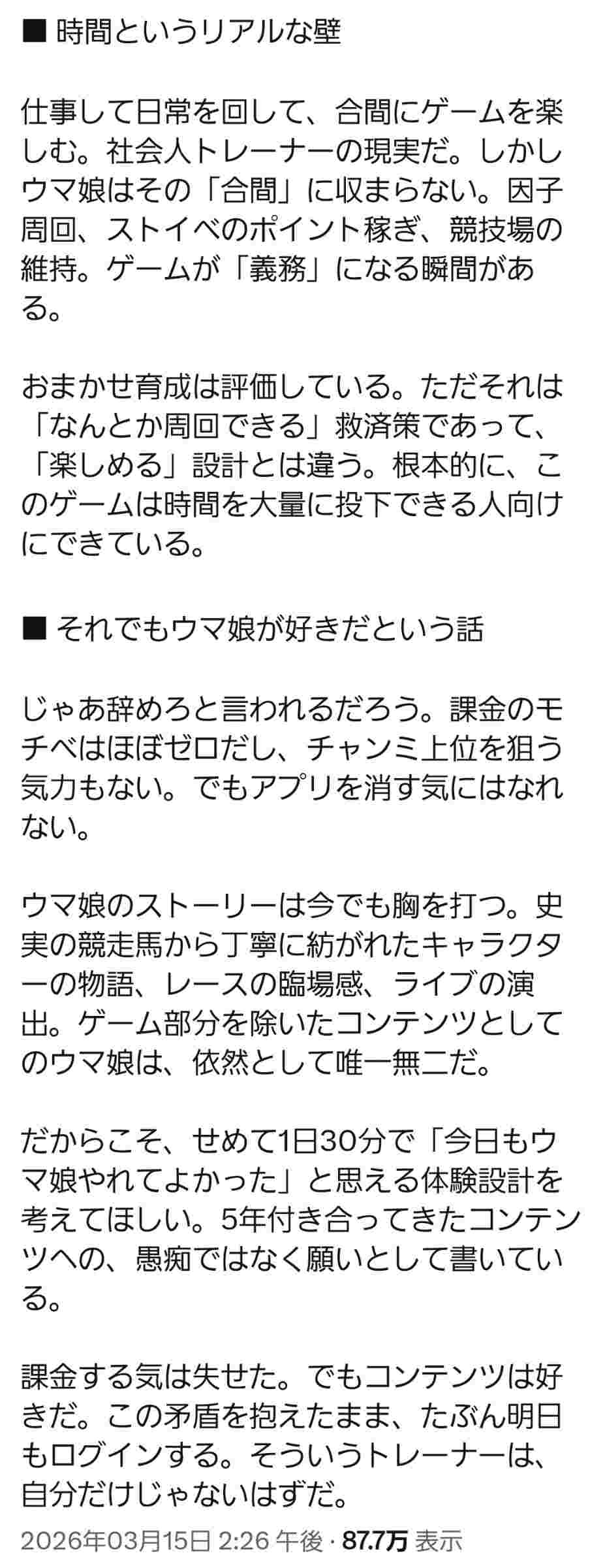 ウマもチャンミが始まって少しして勝てなくなったタイミングでやめたわ - 27 : 2026/03/16(月) 08:32:35.498 ID:Pt2k6Ema9