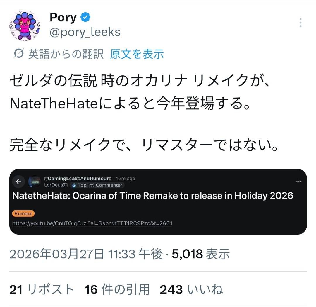 超速報!100%リーカーNate「時のオカリナリメイクが今年登場する」