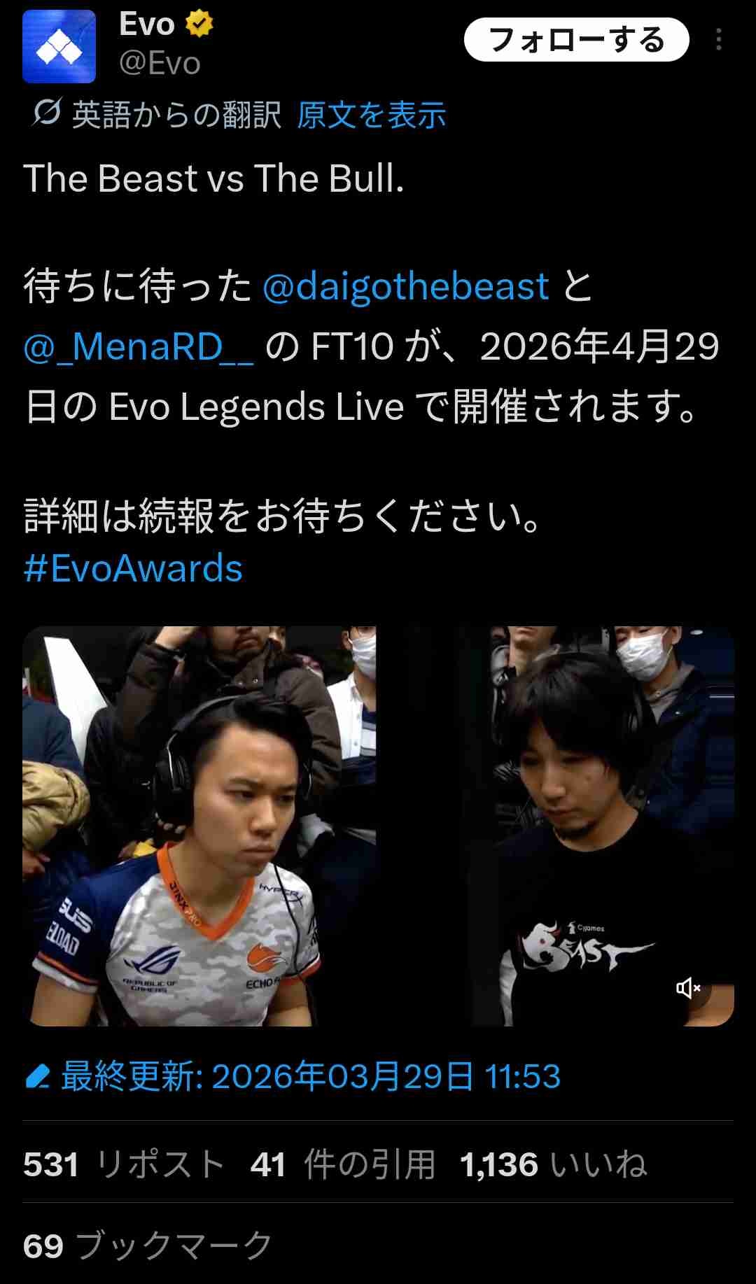 - 格ゲー全然知らんときにニコ生のEVO配信でたまたま見たゲマビとの試合でファンになったけどまたあんな感じの試合が見たい