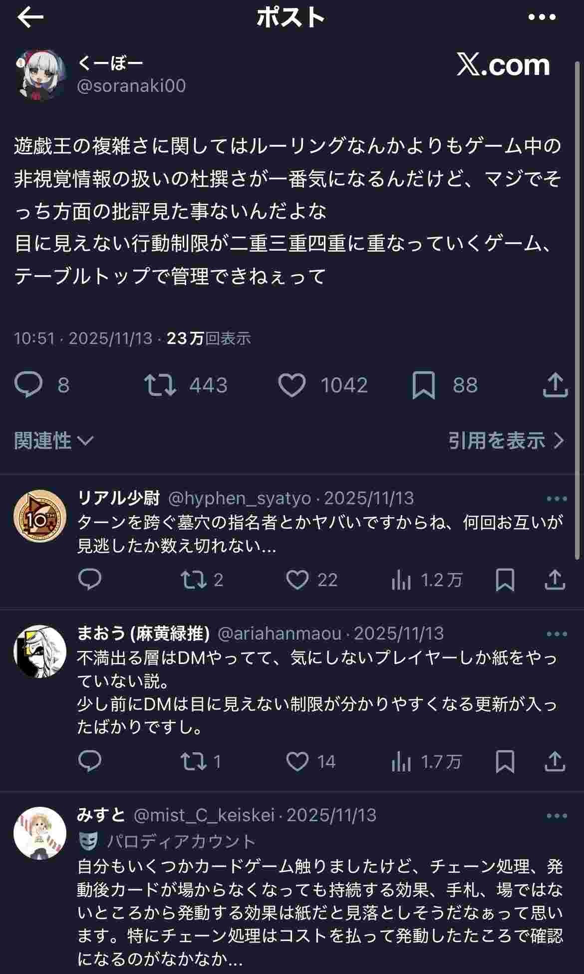 MDの初期はまだ展開決まればイージーウィンで誘発撃ってそれ止めるって感じでシンプルやったけど今はなんでも無効系規制してやりとり増やしたから死ぬほど難易度上がりすぎて末期シャドバみたいになってるわVSK9とかタイムアウト多すぎてまともに使えんぞ