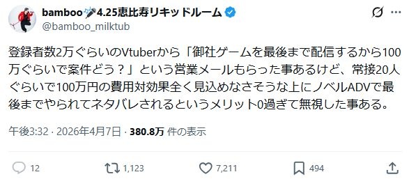 エ口ゲメーカー『OVERDRIVE』元社長「登録2万同接20のVtuberから"御社ゲームを配信するので100万どう?"と依頼が来たけど無視した」