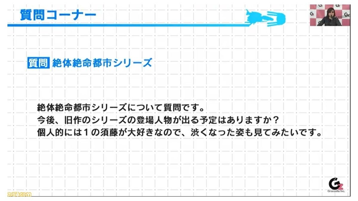 『R-TYPE FINAL2』のダウンロードコンテンツ(DLC)やメジャーアップデート情報が中心となった本配信だったが、配信後半の“質問コーナー”では、『絶体絶命都市5』の質問が登場。