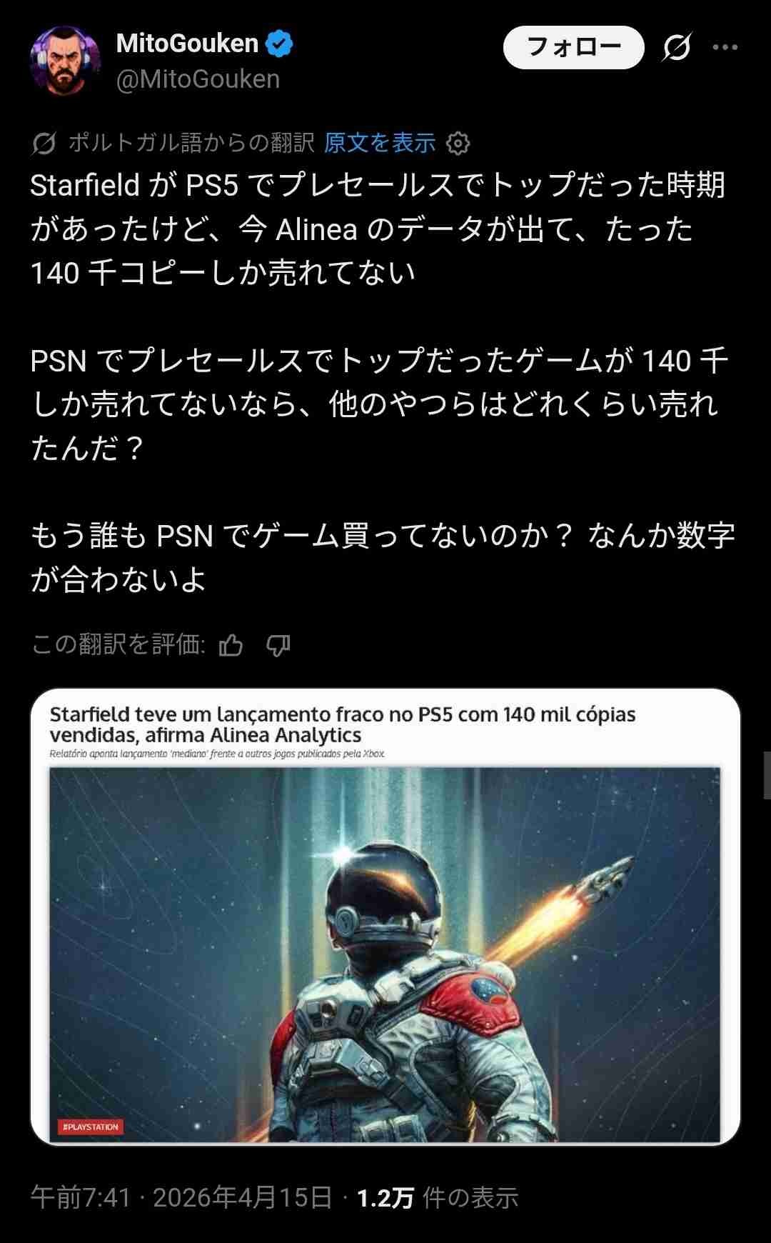 これがSwitch2の売上げについてのツイートだったらお前は狂喜乱舞して祭り上げてるだろうな - 33 : 2026/04/15(水) 18:24:30.59 ID:h1lNwTkx0