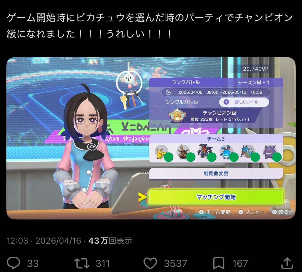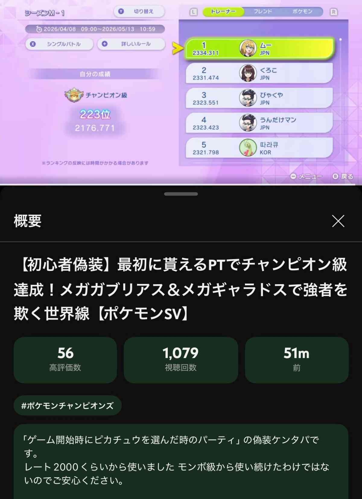 ポケモンで500位入るのって比べ物にならんぐらい難しい?だとしたら300位のチャンピオン級なんて一生無理やな - 99 : 2026/04/16(木) 19:25:34.154 ID:s6SSQC/dw