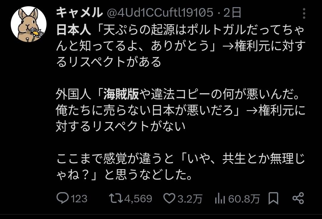 - 自分が権利者でもないのに権利者と同じ「日本人」というだけでなぜか被害者ぶってるやつ多すぎる