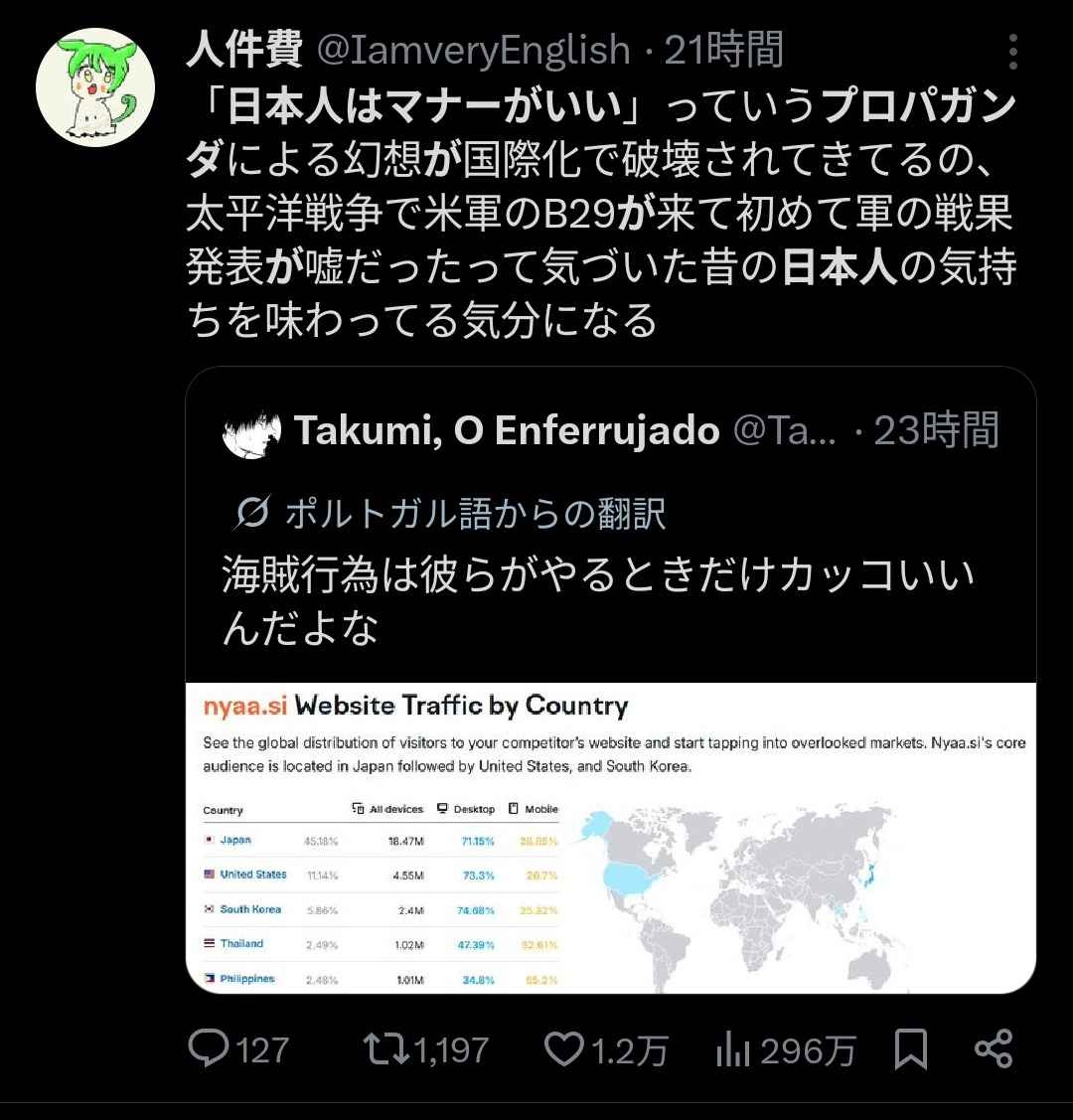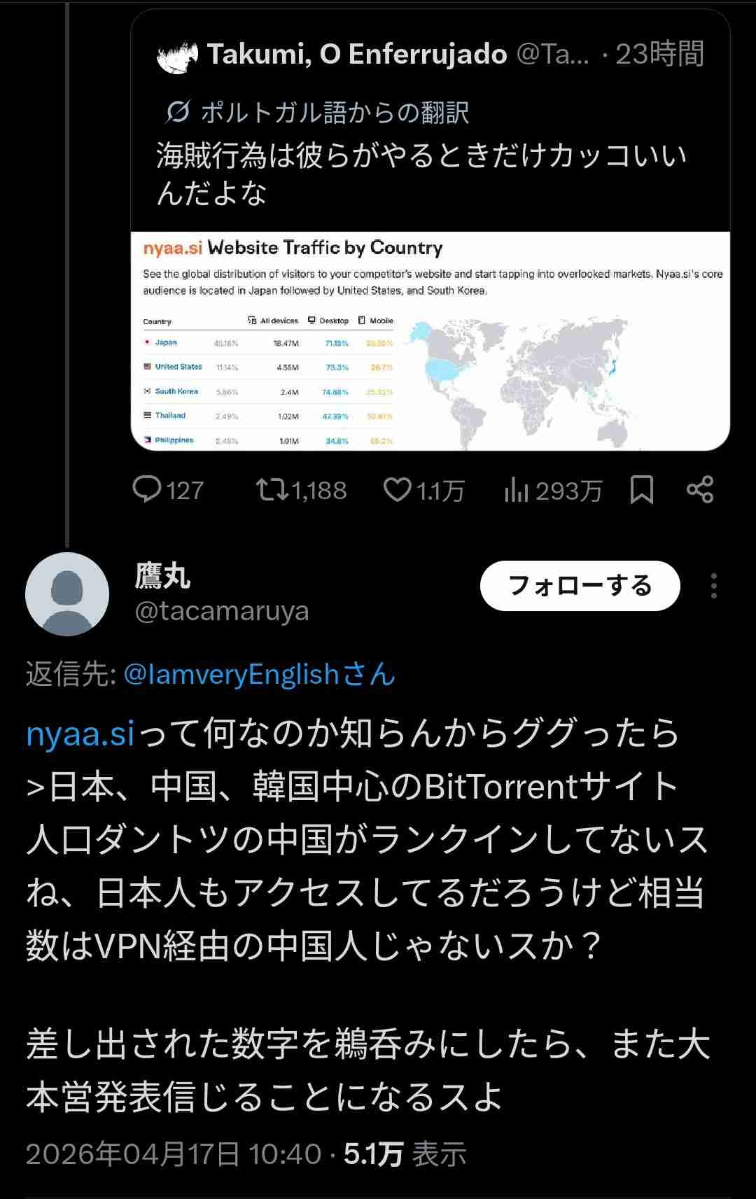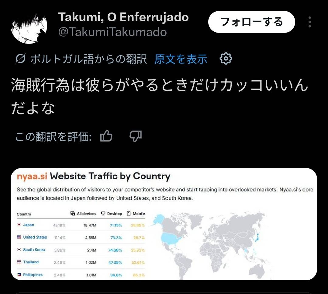Twitter日本人「海賊版サイトを正当化するのやめろよ」海外「でも日本が一番アクセスしてる国じゃん」