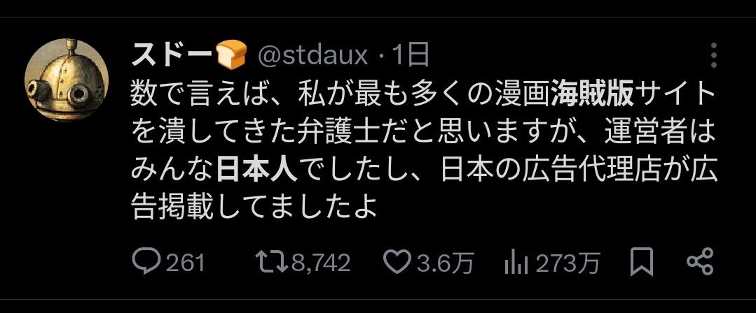 - 「海賊版サイトの申し立てしてたけど運営者は日本人で広告出してるのも日本だったぞ」