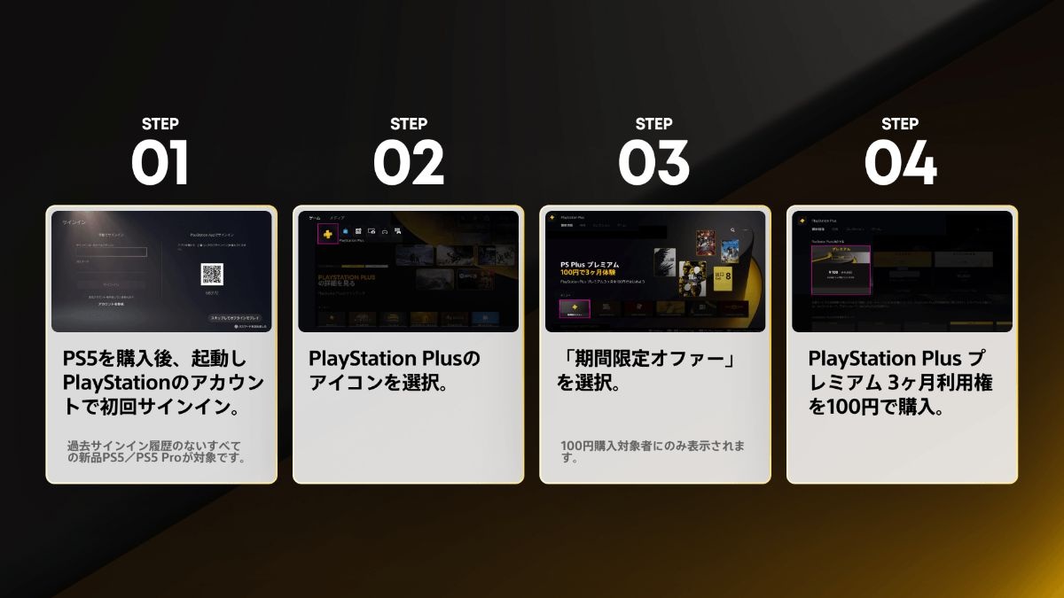 - PlayStation®5 は今が買い時! PS5へ初回サインインでPlayStation®Plus プレミアム 3ヶ月利用権が100円(税込)に!