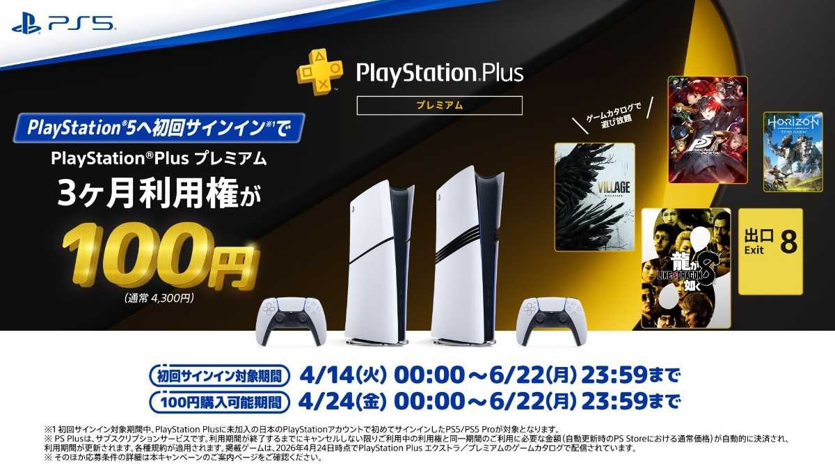 - 4月14日(火)から6月22日(月)までの期間に、PlayStation®Plusに未加入の日本のPlayStation®のアカウントでPlayStation®5/PlayStation®5 Proへ最初にサインイン(以下「初回サインイン」)されたお客様を対象に、「PlayStation Plus プレミアム 3ヶ月利用権」を100円(税込)でご購入いただけるキャンペーンを実施中です。
