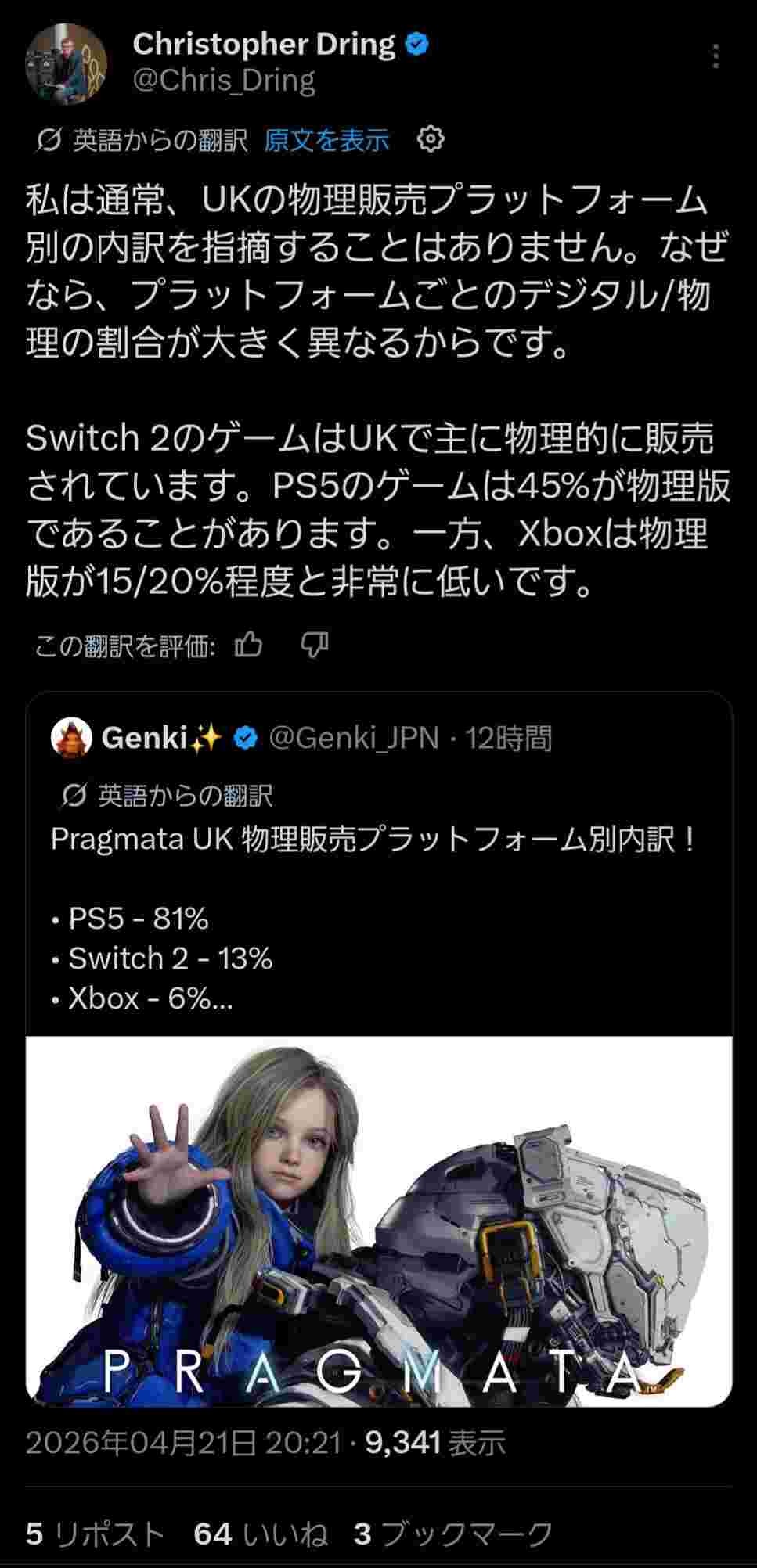 Chris Dring「Switch2はソフト売上の大半がパッケージで、PS5はDL比率55%」