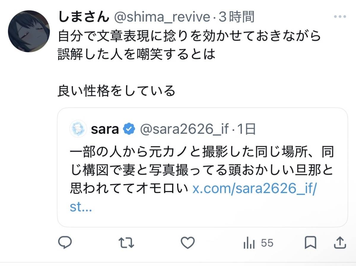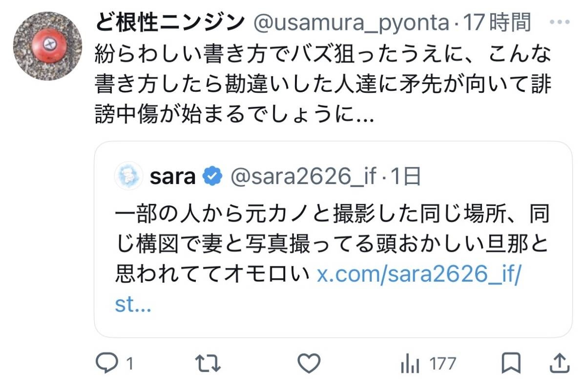 - なんかそのうち逆ギレしたまんさんが写真家の顔がキモい、奥さんをこんなことに突き合わせるな、とか斜め上の方向から叩き始めそう