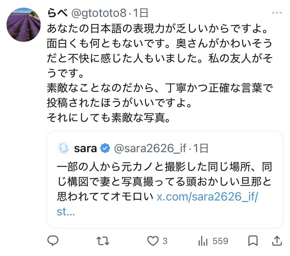 写真家「3年前に彼女と撮影したところで、妻と撮ってきた」→X民「この男、最低すぎ。」