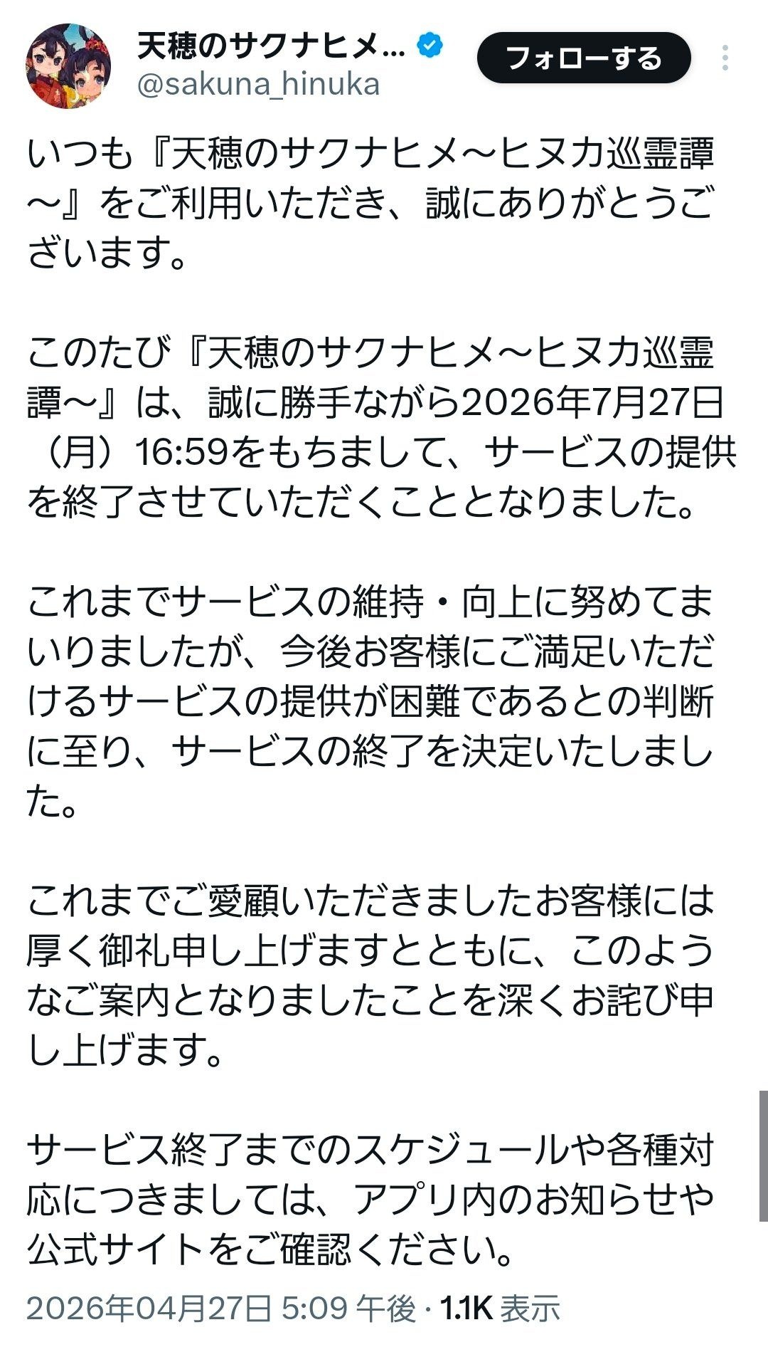 天穂のサクナヒメ~ヒヌカ巡霊譚~サービス終了www