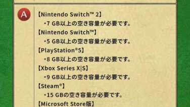 ドラゴンクエスト1&2(Switch2版)=17.0GB、ドラゴンクエスト7(Switch2版)=6.8GB